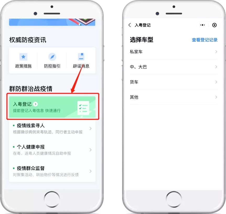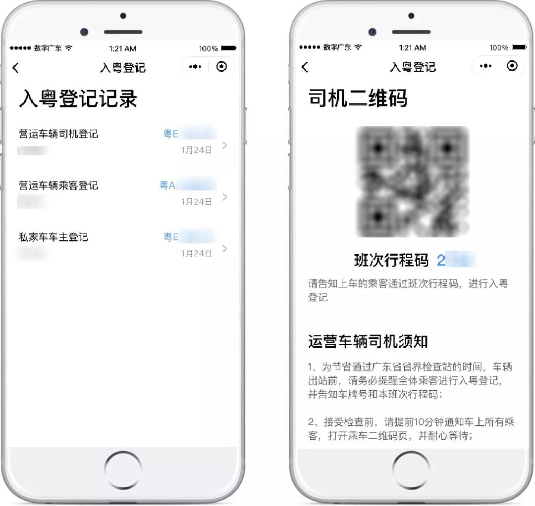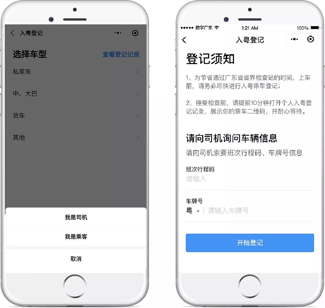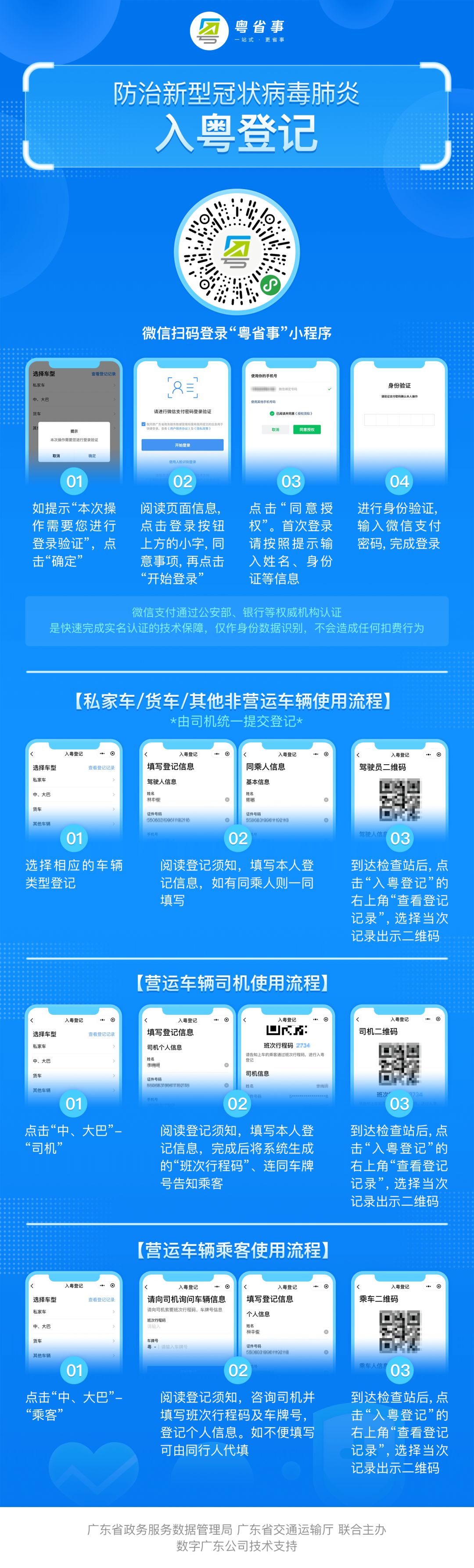 粵省事“疫情防控服務(wù)專(zhuān)區(qū)” 新增“入粵登記”服務(wù) 【“入粵登記”服務(wù)】 “入粵登記”服務(wù)主要面向外來(lái)入粵的司機(jī)、乘客群體,在進(jìn)入廣東省時(shí)登記個(gè)人信息并記錄體溫。 所有進(jìn)入廣東省內(nèi)的司機(jī)乘客都需要進(jìn)行登記,其中: 1、私家車(chē)、貨車(chē)、其他車(chē)輛由司機(jī)填寫(xiě)入粵登記,如有同乘人,則由司機(jī)一同登記。 2、中巴、大巴等營(yíng)運(yùn)車(chē)輛,司機(jī)與乘客分別填寫(xiě)入粵登記,如有不便操作的乘客,可由同行人代填。 為節(jié)省通過(guò)廣東省省界檢查站的時(shí)間,建議出發(fā)前應(yīng)提前對(duì)車(chē)輛信息及乘員信息進(jìn)行登記,并在進(jìn)入防疫站檢測(cè)前提前打開(kāi)二維碼界面,以節(jié)省核驗(yàn)檢查時(shí)間。 點(diǎn)擊上方圖片 保存或轉(zhuǎn)發(fā)“入粵登記”流程 給身邊的人 一起提前登記,快速通過(guò)防疫站 下面一起來(lái)看看 “入粵登記”的詳細(xì)操作介紹 和常見(jiàn)問(wèn)題解答吧 “入粵登記”服務(wù)入口 (1)微信搜索進(jìn)入“粵省事”小程序,首頁(yè)“抗擊疫情”版塊,點(diǎn)擊“入粵登記”服務(wù)。 (2)微信搜索進(jìn)入“粵省事”小程序,下滑至“專(zhuān)區(qū)”版塊點(diǎn)擊進(jìn)入“疫情防控服務(wù)專(zhuān)區(qū)”,或直接點(diǎn)擊下方圖片進(jìn)入專(zhuān)區(qū)。 進(jìn)入“疫情防控服務(wù)專(zhuān)區(qū)”后,下滑點(diǎn)擊“入粵登記”,司機(jī)或乘客可根據(jù)實(shí)際情況選擇類(lèi)型進(jìn)入登記。后續(xù)可從該界面右上角“查看登記記錄”進(jìn)入找到相關(guān)登記記錄。 私家車(chē)/貨車(chē)/其他車(chē)輛 駕駛?cè)嗽诔霭l(fā)前,點(diǎn)擊進(jìn)入“入粵登記”服務(wù),選擇相應(yīng)的車(chē)輛類(lèi)型,閱讀服務(wù)須知后填寫(xiě)駕駛?cè)诵畔ⅲㄗ⒁鉁?zhǔn)確填寫(xiě)號(hào)牌種類(lèi)),如獨(dú)自駕駛,確認(rèn)無(wú)誤后可直接提交。 如車(chē)上有同行乘客,需一并填報(bào)同乘人員信息,點(diǎn)擊“錄入同乘人信息”,可添加多位乘客信息。添加完畢后確認(rèn)信息并提交即可。 到達(dá)檢查站,駕駛員在“粵省事”的“入粵登記記錄”找到對(duì)應(yīng)記錄,出示對(duì)應(yīng)乘車(chē)二維碼,檢查員掃碼核驗(yàn),待檢查員測(cè)量全車(chē)人員體溫、提交信息后通過(guò)。 中大巴司機(jī) 駕駛員出發(fā)前,進(jìn)入“入粵登記”服務(wù),點(diǎn)擊“中、大巴”選擇“司機(jī)”,并填寫(xiě)登記信息(注意準(zhǔn)確填寫(xiě)號(hào)牌種類(lèi)),確認(rèn)無(wú)誤后可提交。 到達(dá)檢查站,駕駛員進(jìn)入“入粵登記”服務(wù),點(diǎn)擊右上角“查看記錄”找到對(duì)應(yīng)記錄,點(diǎn)擊相應(yīng)車(chē)牌,出示對(duì)應(yīng)乘車(chē)二維碼給檢查員核驗(yàn),待檢查員測(cè)量體溫、提交信息后通過(guò)。 如有乘客詢(xún)問(wèn)班次行程碼也可從此進(jìn)入獲取。 中、大巴車(chē)乘客 乘客在出發(fā)前向司機(jī)索取班次行程碼及車(chē)牌號(hào),進(jìn)入“入粵登記”服務(wù),點(diǎn)擊“中、大巴登記”選擇“乘客”,填入班次行程碼及車(chē)牌號(hào)。 填寫(xiě)乘客登記信息,確認(rèn)無(wú)誤后可提交。 到達(dá)檢查站后,乘客在“入粵登記”服務(wù),點(diǎn)擊右上角“查看記錄”找到對(duì)應(yīng)記錄,點(diǎn)擊當(dāng)次乘坐的對(duì)應(yīng)車(chē)牌,出示對(duì)應(yīng)乘車(chē)二維碼給檢查員核驗(yàn),待檢查員測(cè)量體溫、提交信息后通過(guò)。 常見(jiàn)問(wèn)題答疑 Q:是否支持代辦? 私家車(chē)/貨車(chē)/其他類(lèi)型車(chē)輛需由司機(jī)統(tǒng)一代全車(chē)人員辦理;中、大巴車(chē)乘客如有多人同行,可由同行人代為辦理。 Q:支持哪些人士辦理,有無(wú)戶籍、城市等限制? 支持持有有效二代居民身份證的用戶實(shí)名認(rèn)證后辦理,無(wú)城市、戶籍限制,暫不支持港澳、臺(tái)灣人士及外籍人士辦理,因此如遇嬰幼兒乘客、港澳人士、臺(tái)灣人士、外籍人士等人群,敬請(qǐng)咨詢(xún)檢查員其他處理方法。 Q:本人如上報(bào)多次記錄以哪條為準(zhǔn)? 以用戶出示的二維碼對(duì)應(yīng)的記錄為準(zhǔn)。 Q:如提交失敗如何處理? 請(qǐng)確認(rèn)是否網(wǎng)絡(luò)導(dǎo)致,建議切換網(wǎng)絡(luò)或前往良好的網(wǎng)絡(luò)環(huán)境再作嘗試。 Q:在粵省事使用微信支付密碼登錄安全嗎? “粵省事”為廣東省人民政府主辦的移動(dòng)政務(wù)服務(wù)平臺(tái),保障您的信息安全,本次使用微信支付密碼登錄,僅為了讓您快速實(shí)名認(rèn)證辦理“入粵登記”服務(wù),請(qǐng)放心使用。 Q:從省外入粵,先到廣東A地,再到廣東B地,怎么填? 填寫(xiě)A地,即初始進(jìn)入廣東省界所在地市為準(zhǔn)。 Q:本來(lái)就是粵牌車(chē),從省外入粵是否還要登記? 為加強(qiáng)疫情防控,凡進(jìn)入廣東省界車(chē)輛請(qǐng)按照有關(guān)政策辦理入粵登記。 Q:提前幾天登記可以嗎?現(xiàn)在登記什么時(shí)候入粵都可以嗎? 如您已確認(rèn)行程,為保證您順暢通行,建議您可提前辦理入粵登記。 Q:不登記可以入廣東嗎?? 為加強(qiáng)疫情防控,建議您辦理入粵登記,如因特殊原因無(wú)法辦理,請(qǐng)