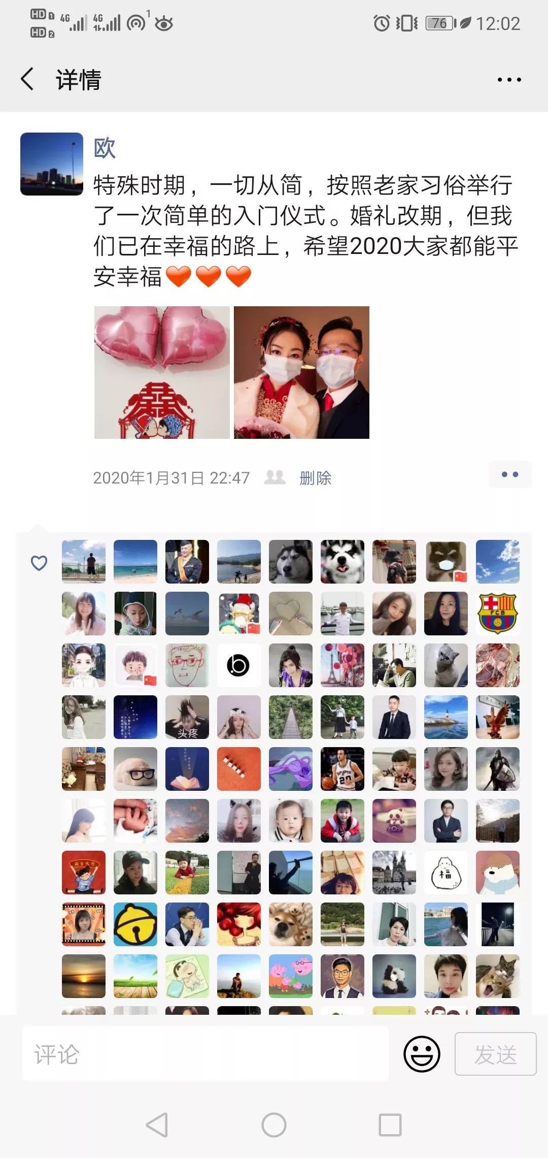 歐泉強(qiáng)的親朋好友紛紛點(diǎn)贊這場(chǎng)朋友圈“兩個(gè)人的婚禮”,并留言祝福?!叭∠麛[酒都是小事,做好防疫工作才是大事。作為黨員,聽(tīng)黨號(hào)召是第一條,今年春節(jié)不聚,對(duì)他人好,對(duì)家人好,更是對(duì)自己的愛(ài)人好?!睔W泉強(qiáng)說(shuō)。