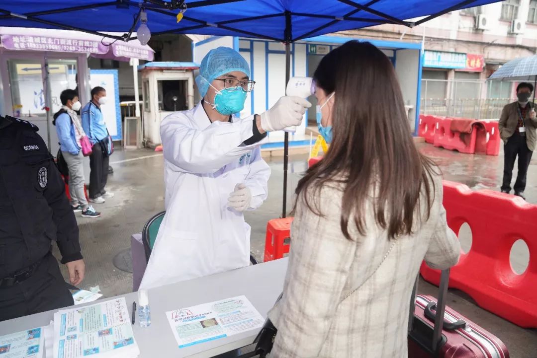 ▲1月25日,新城汽車客運(yùn)站,醫(yī)護(hù)人員給出站旅客測量體溫。(資料圖)