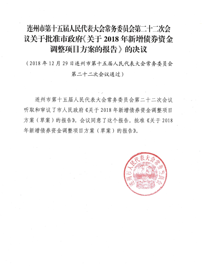 連州市第十五屆人民代表大會(huì)常務(wù)委員會(huì)第二十二次會(huì)議關(guān)于批準(zhǔn)市政府《關(guān)于2018年新增債務(wù)資金調(diào)整項(xiàng)目方案的報(bào)告》的決議