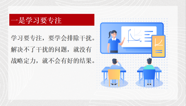 班主任還介紹了如何在疫情期科學(xué)做好停課不停學(xué)。一是學(xué)習(xí)要專注;二是緩急相濟(jì),合理利用;三是及時(shí)獎(jiǎng)賞,有收獲感;四是確定目標(biāo),每天檢查,在完成學(xué)校老師線上布置的功課外,對(duì)各學(xué)科的知識(shí)進(jìn)行查漏補(bǔ)缺,建立知識(shí)系統(tǒng),為即將到來(lái)的新學(xué)期做好充分準(zhǔn)備。