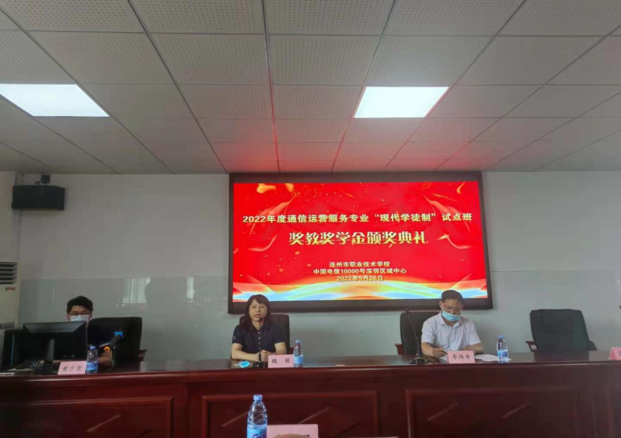 為進一步促進校企合作發(fā)展,引導(dǎo)鼓勵學(xué)生奮發(fā)向上,刻苦學(xué)習(xí),激勵教師不斷努力,扎實教學(xué)。2022年5月26日,連州市職業(yè)技術(shù)學(xué)校在綜合樓607會議室舉行2022年度通信運營服務(wù)專業(yè)現(xiàn)代學(xué)徒制試點班獎教獎學(xué)金頒獎典禮。中國電信10000號深圳區(qū)域中心魏萌經(jīng)理、王盛棟主管,連州市職業(yè)技術(shù)學(xué)校校長李偉奇等相關(guān)領(lǐng)導(dǎo)、老師以及通信運營服務(wù)班的同學(xué)們參加了本次儀式。儀式由中國電信10000號深圳區(qū)域中心導(dǎo)師陳柯夫主持。