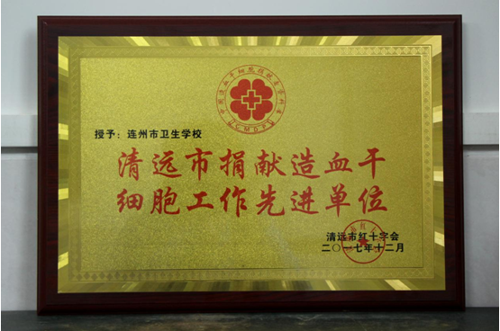 由于連州衛(wèi)生學(xué)校在此項(xiàng)工作取得了顯著成效,清遠(yuǎn)市紅十字會(huì)秘書長胡志年在會(huì)上授予連州衛(wèi)生學(xué)?!扒暹h(yuǎn)市捐獻(xiàn)造血干細(xì)胞工作基地”和“清遠(yuǎn)市捐獻(xiàn)造血干細(xì)胞工作先進(jìn)單位”稱號(hào)。