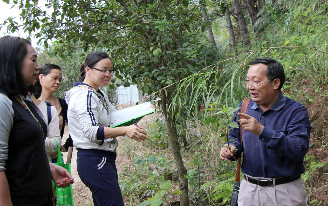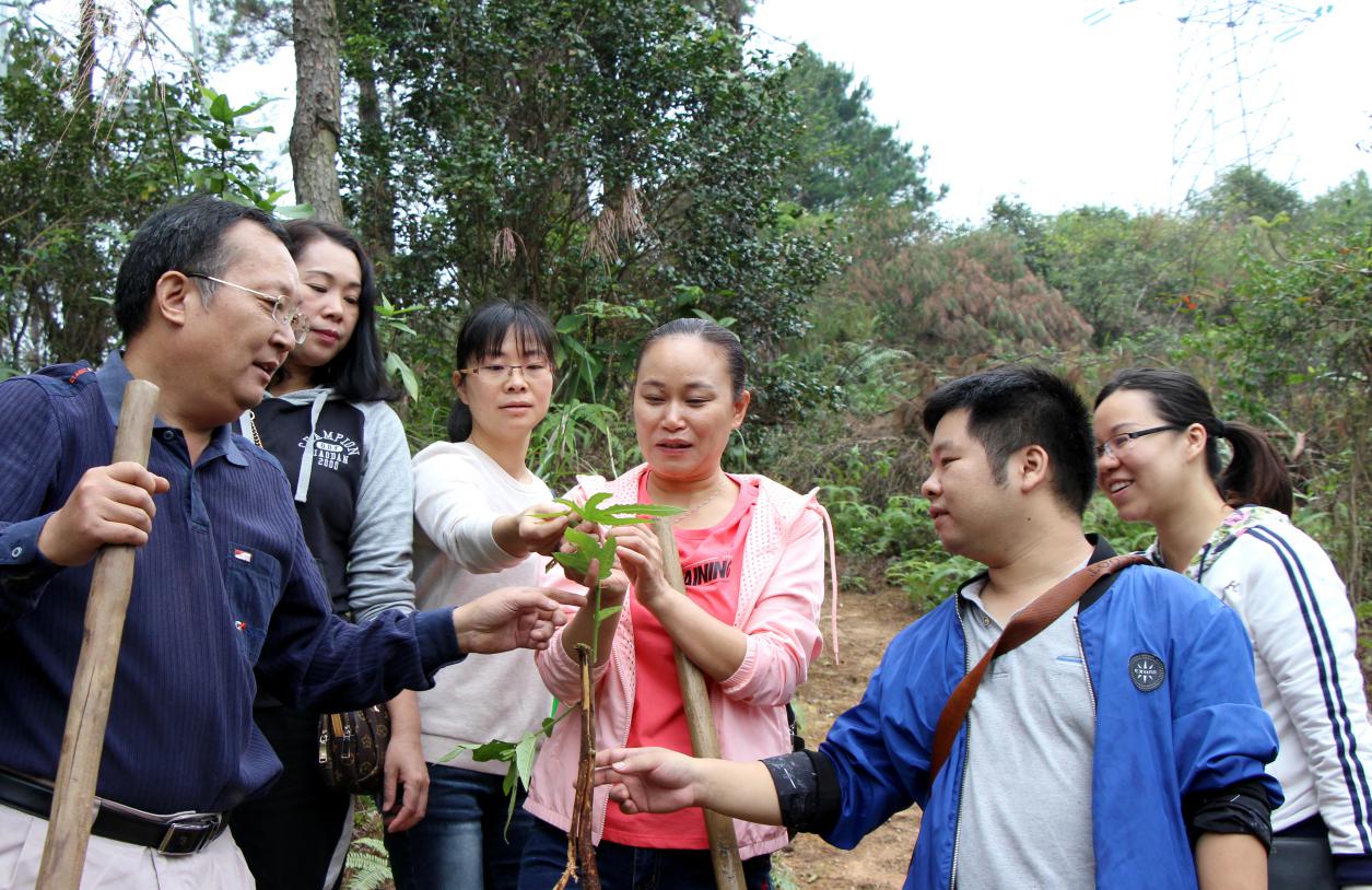 本次拓展活動主要由何圣鑫、歐團結(jié)以及9名藥學(xué)老師組成。到達野外實踐活動區(qū)后,歐團結(jié)用通俗易懂的語言,耐心細致地對發(fā)現(xiàn)每一種藥用植物都向老師們一一說出它們的藥名、科別、形態(tài)特征、采收期、藥用部分、功效、用途等。這種生動形象的授課方式深深地吸引了這群年輕教師。大家在認(rèn)真聽講的同時,邊用手機拍攝并標(biāo)注藥名,留資料鞏固學(xué)習(xí),并采摘了部分中草藥制作藥物標(biāo)本。此次培訓(xùn)共對40余種中草藥進行辨識,使年輕教師受益匪淺。