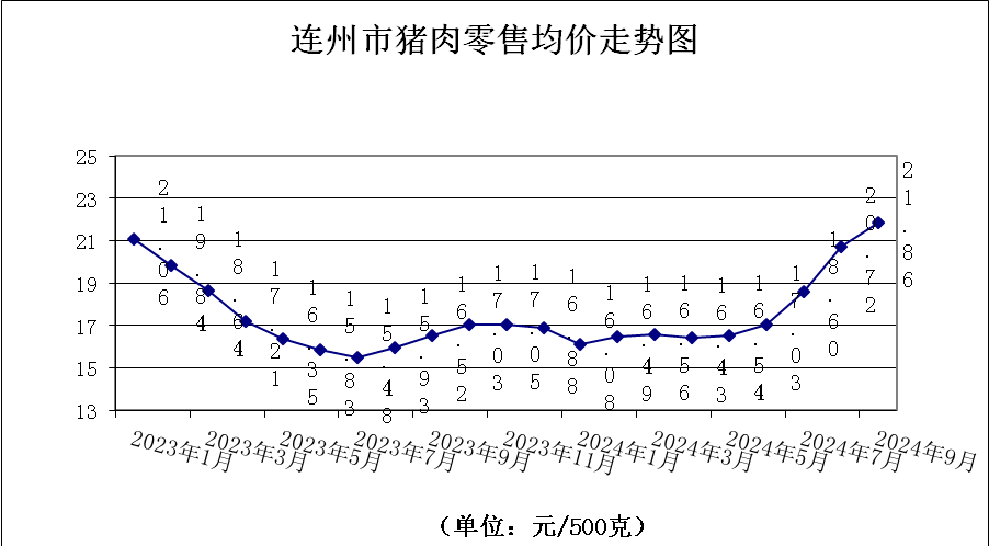 9月份,我市豬肉零售價格持續(xù)上升,漲幅有所收窄。農(nóng)貿(mào)市場監(jiān)測的四種主要豬肉零售均價為21.86元/500克,環(huán)比升5.50%。其中,排骨30.92元/500克,環(huán)比升7.77%;精瘦肉21.50元/500克,環(huán)比升1.99%;肋條肉17.50元/500克,環(huán)比升5.68%,有皮上肉17.50元/500克,環(huán)比升5.68%。