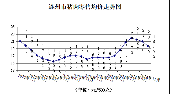 12月份,我市豬肉零售價(jià)格持續(xù)下降。農(nóng)貿(mào)市場(chǎng)監(jiān)測(cè)的四種主要豬肉零售均價(jià)為19.72元/500克,環(huán)比降6.05%。其中,排骨26.24元/500克,環(huán)比降10.26%;精瘦肉21.21元/500克,環(huán)比降3.50%;肋條肉15.71元/500克,環(huán)比降4.09%,有皮上肉15.71元/500克,環(huán)比降4.09%。