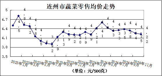 12月份,我市蔬菜價(jià)格持續(xù)下降,降幅收窄。農(nóng)貿(mào)市場(chǎng)監(jiān)測(cè)的30種主要蔬菜零售價(jià)格“10升6平14降”,蔬菜類平均零售價(jià)格為4.22元/500克,環(huán)比降0.71%。其中,葉菜類零售價(jià)格為4.17元/500克,環(huán)比降0.48%,花菜類零售價(jià)格為3.75元/500克,環(huán)比降2.09%,瓜菜類零售價(jià)格為4.29元/500克,環(huán)比降0.46%,根莖類零售價(jià)格為4.37元/500克,環(huán)比降1.35%。