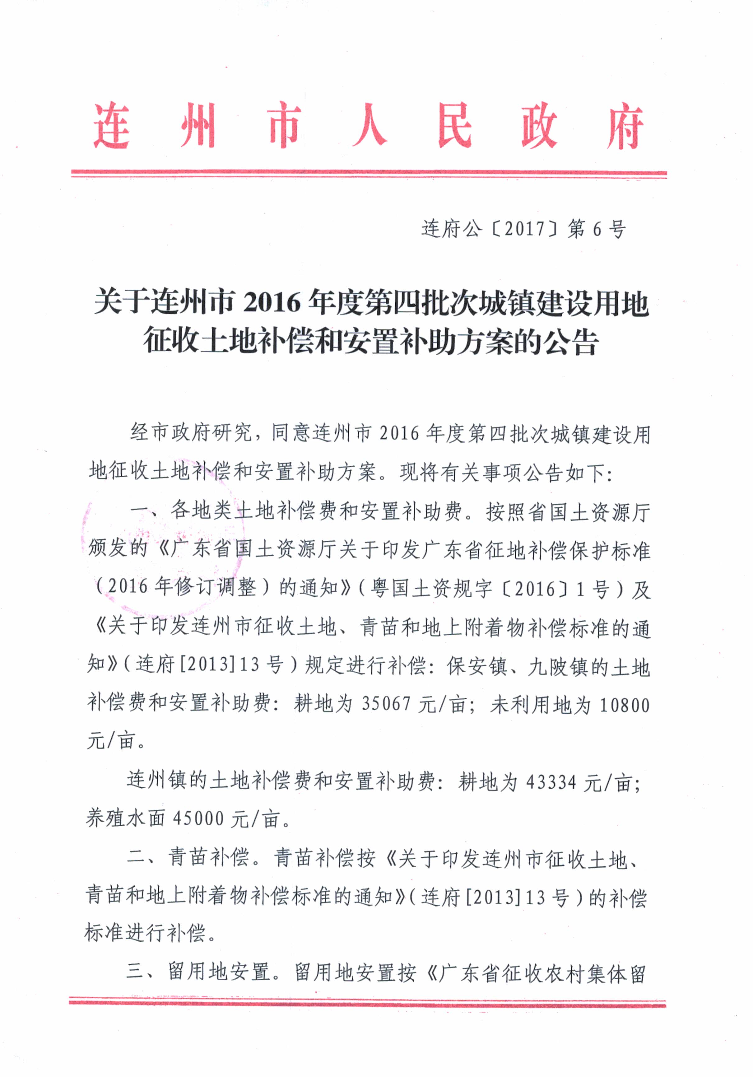 連州市2016年第四批次城鎮(zhèn)建設用地征地補償安置方案公告