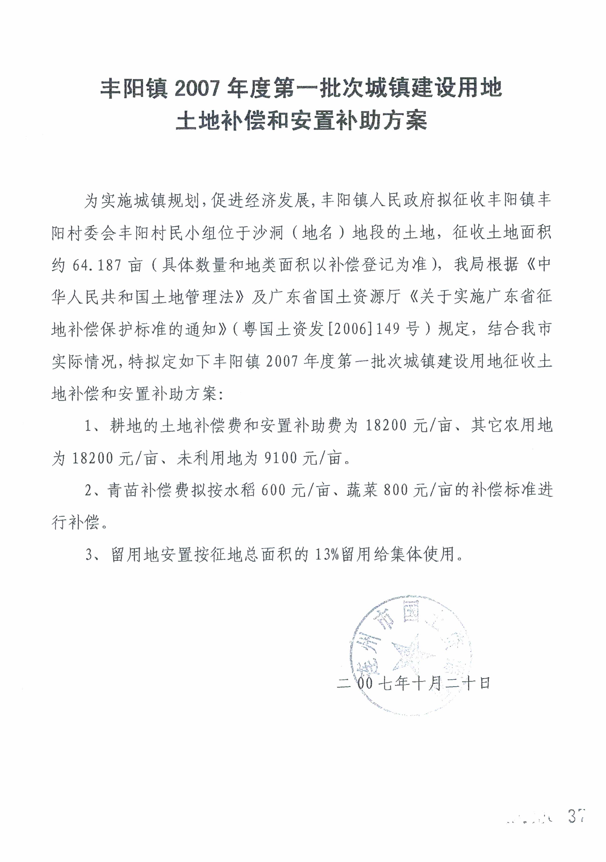 連州市豐陽鎮(zhèn)2007年度第一批次建設(shè)用地補(bǔ)償安置方案公告