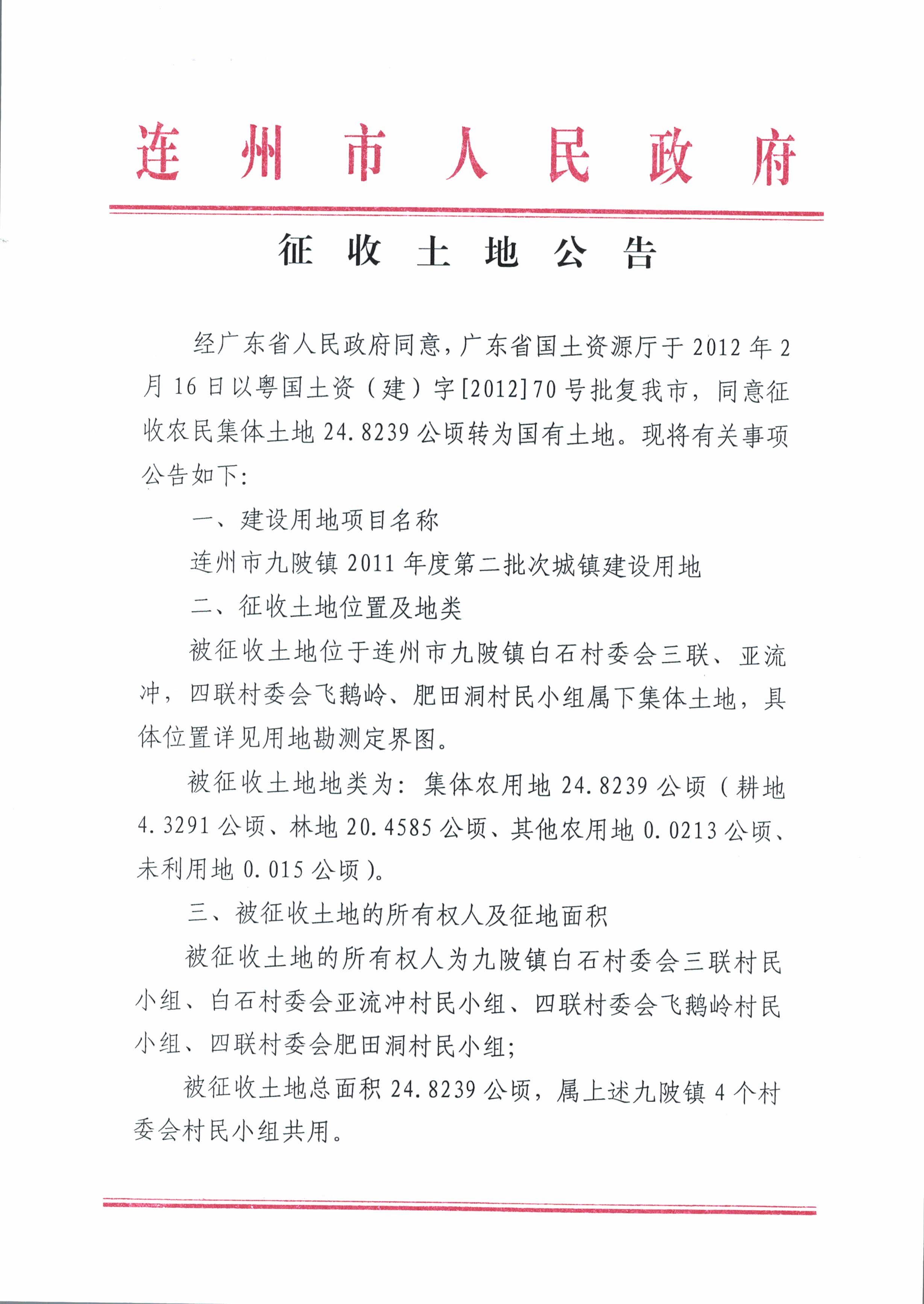 連州市九陂鎮(zhèn)2011年度第二批次城鎮(zhèn)建設(shè)用地征收土地公告