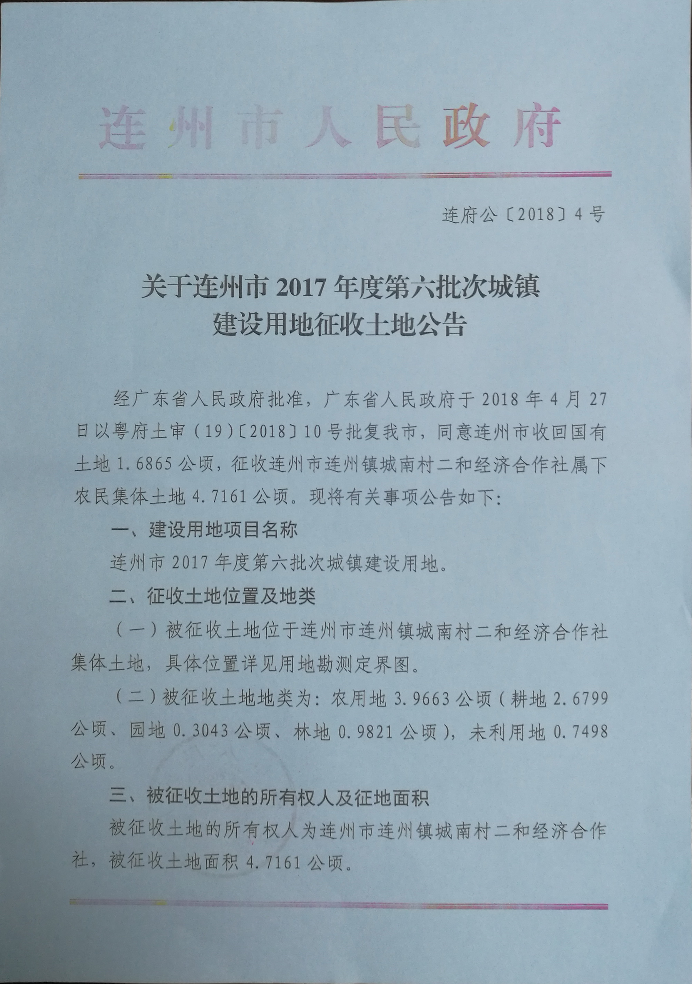 連州市2017年度第六批次城鎮(zhèn)建設(shè)用地征收土地公告