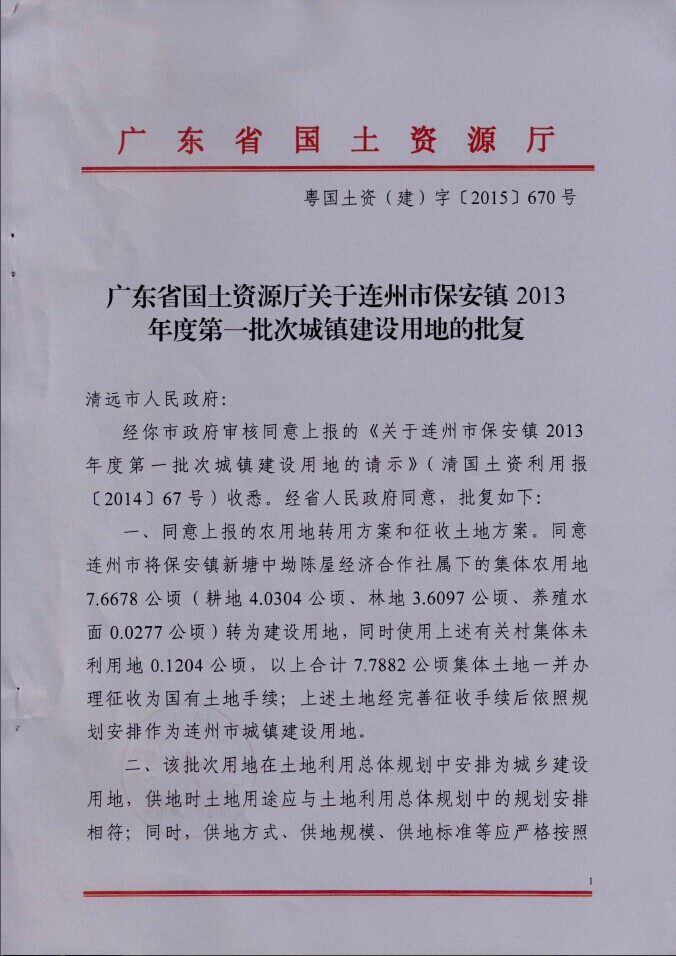 連州市保安鎮(zhèn)2013年度第一批次城鎮(zhèn)建設(shè)用地征地批準(zhǔn)信息