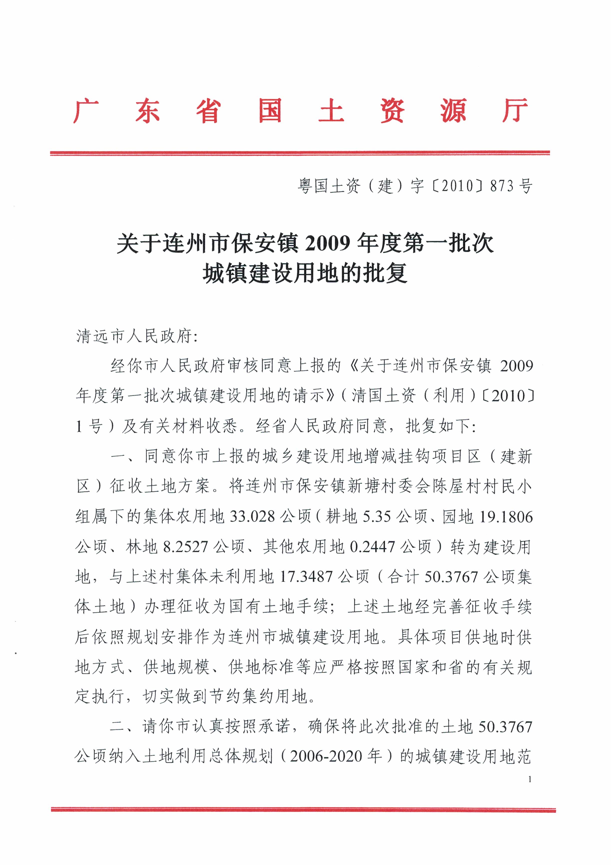 連州市保安鎮(zhèn)2009年度第一批次城鎮(zhèn)建設(shè)用地的批復(fù)