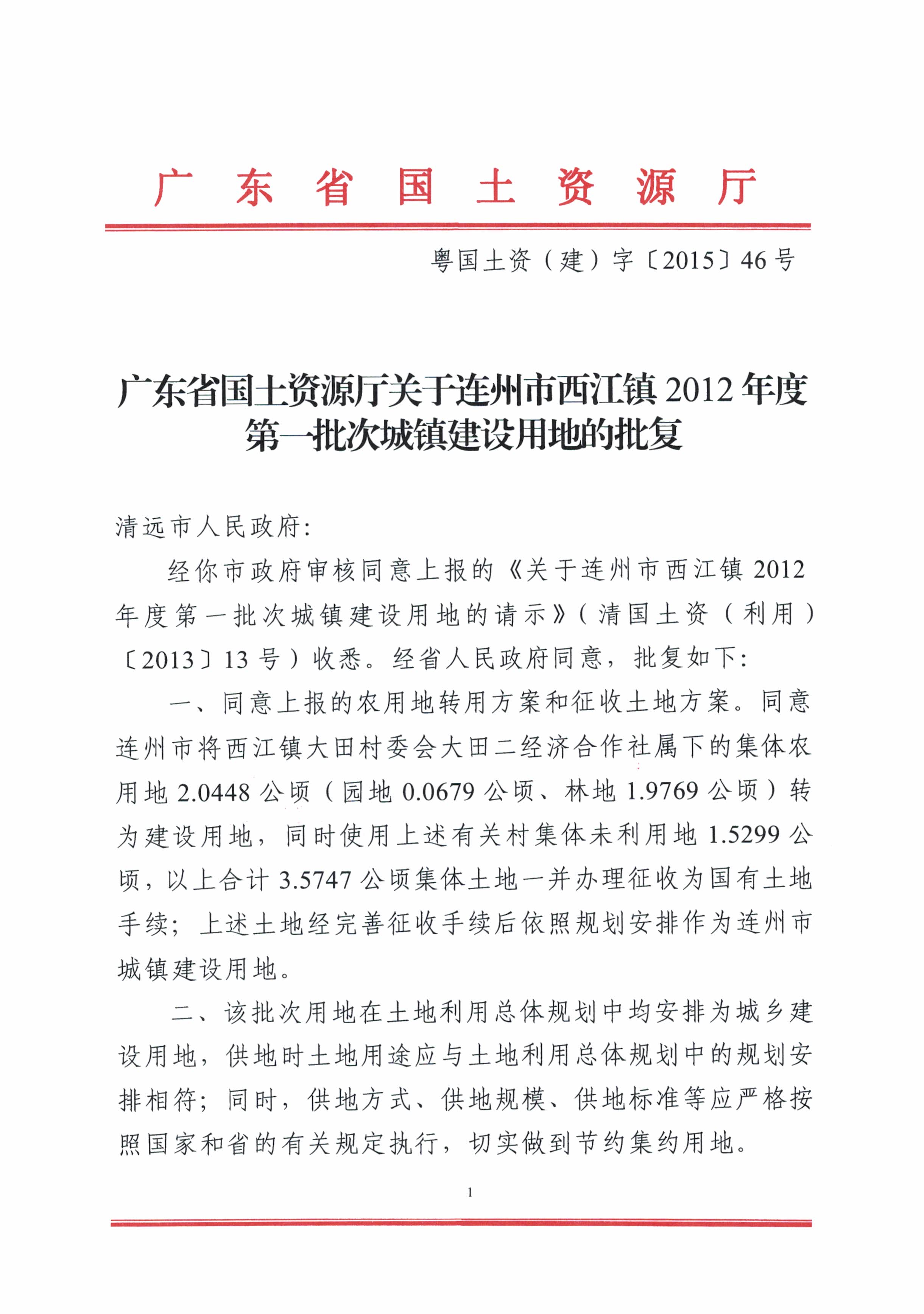 連州市西江鎮(zhèn)2012年度第一批次城鎮(zhèn)建設(shè)用地的批復(fù)