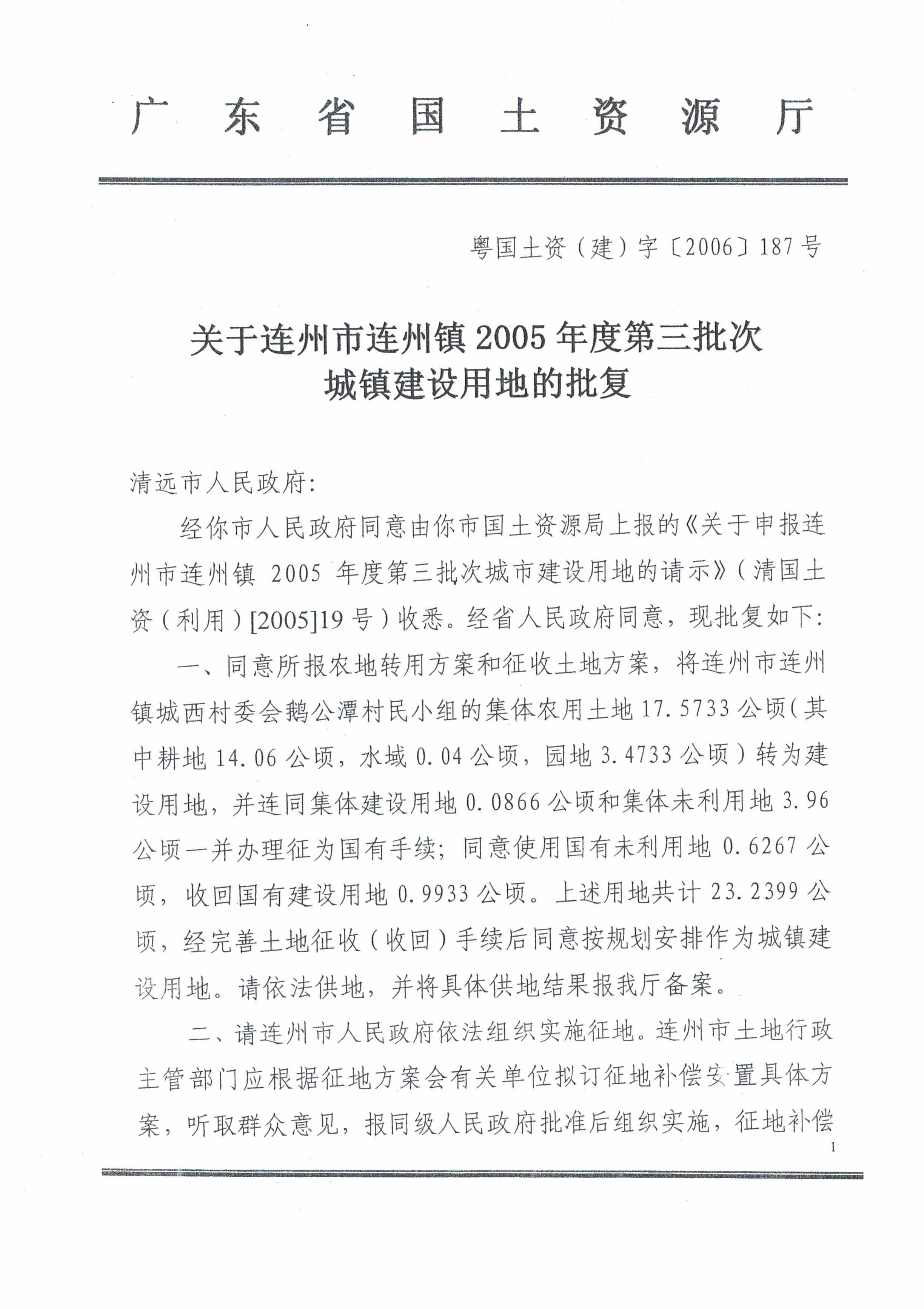 連州市連州鎮(zhèn)2005年度第三批次城鎮(zhèn)建設(shè)用地的批復(fù)