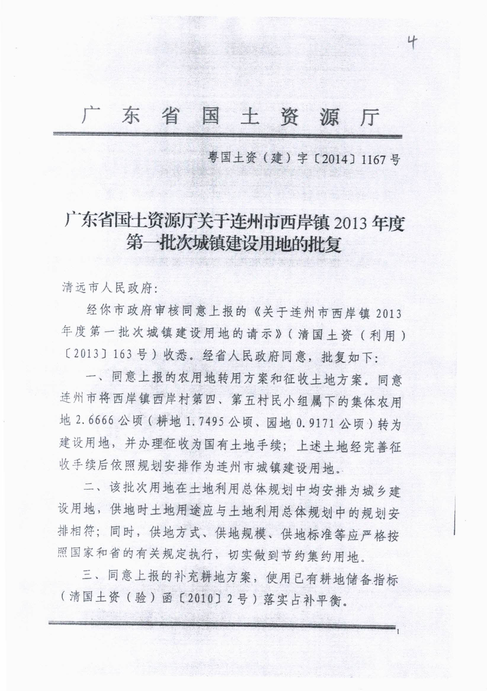 連州市西岸鎮(zhèn)2013年度第一批次城鎮(zhèn)建設(shè)用地的批復(fù)