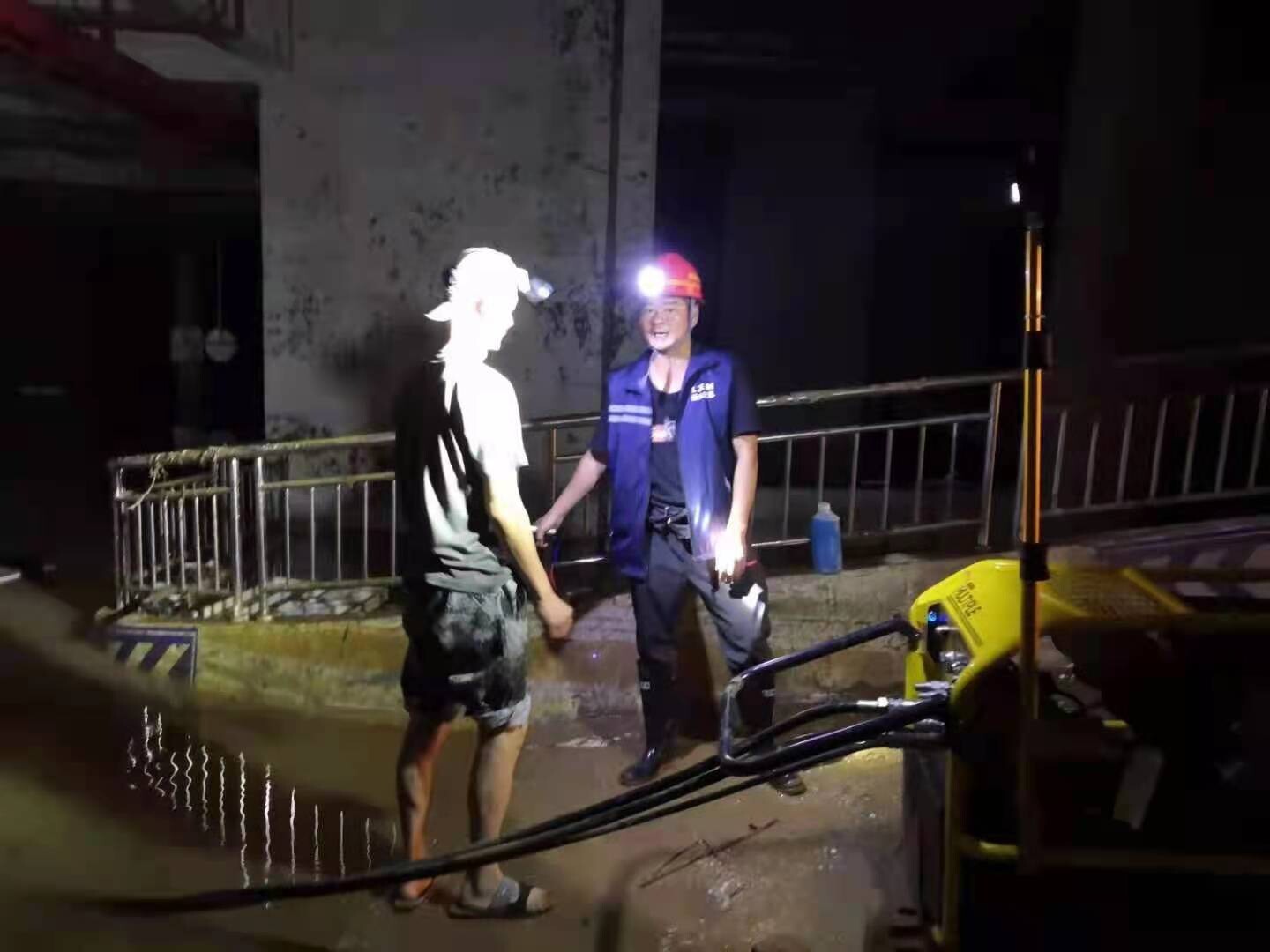 黃國(guó)軍和隊(duì)員一起接駁通風(fēng)管     黃國(guó)軍在積水車庫(kù)指導(dǎo)排水救援工作