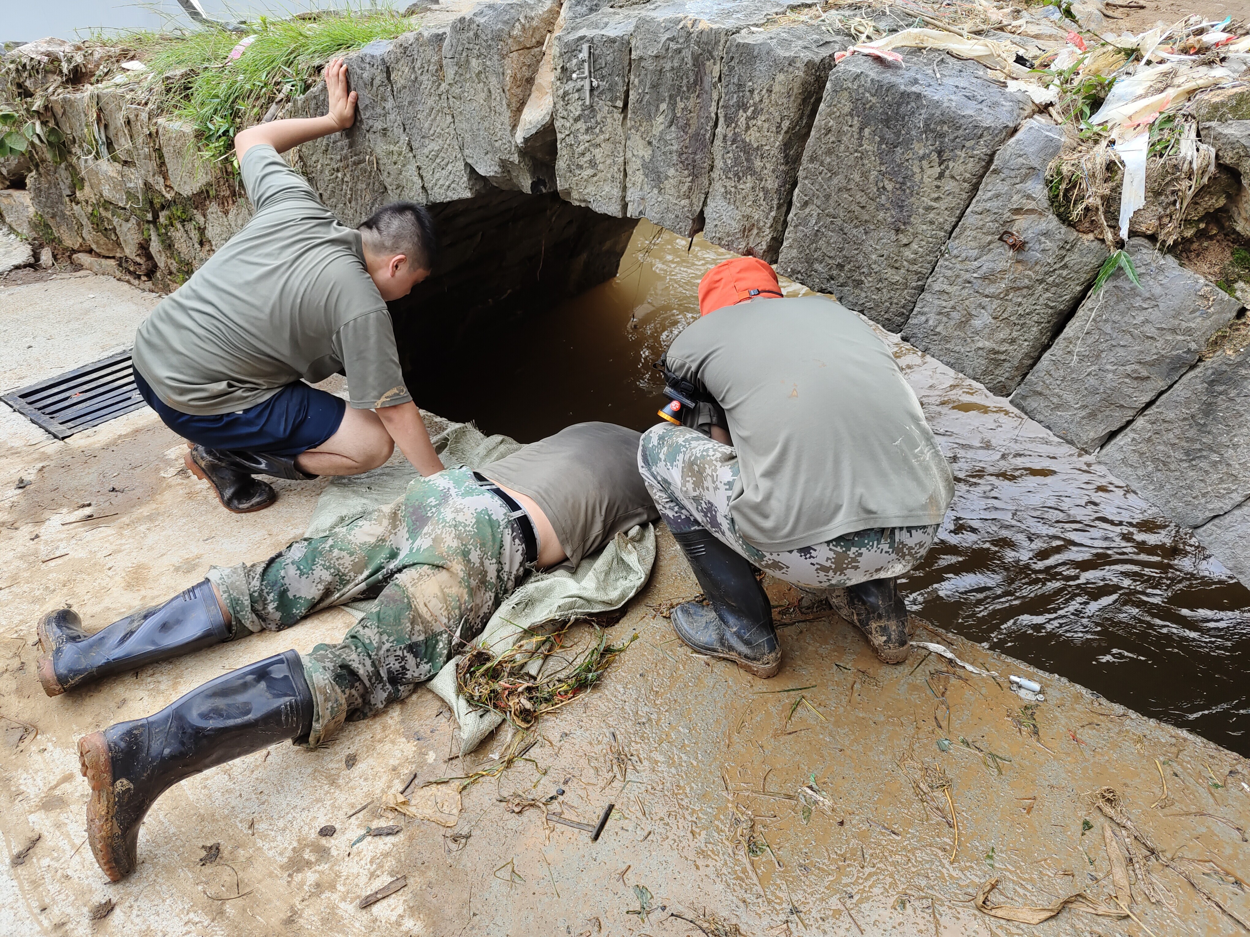 救援隊(duì)在清理水溝淤積雜物
