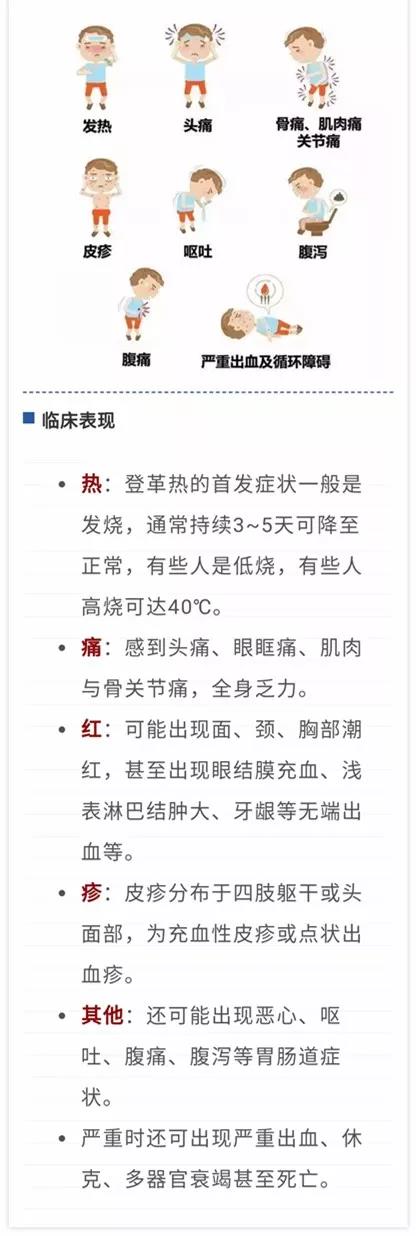 登革熱的臨床表現(xiàn)復(fù)雜多樣,其特征為突起發(fā)病,發(fā)熱是最常見的癥狀,24小時(shí)體溫可達(dá)39℃以上,發(fā)熱一般持續(xù)5~7天。部分病例于發(fā)熱3~5天后,體溫降至正常;1~3天后再次升高,稱為雙峰熱。發(fā)熱時(shí)多伴畏寒、全身肌肉、骨骼和關(guān)節(jié)痛及眼球后痛、乏力、充血性皮疹、食欲不振等,還可出現(xiàn)惡心、嘔吐、腹瀉、多形性皮疹等。部分病人可出現(xiàn)出血性皮疹、出血傾向、腹痛、嘔吐等表現(xiàn)。