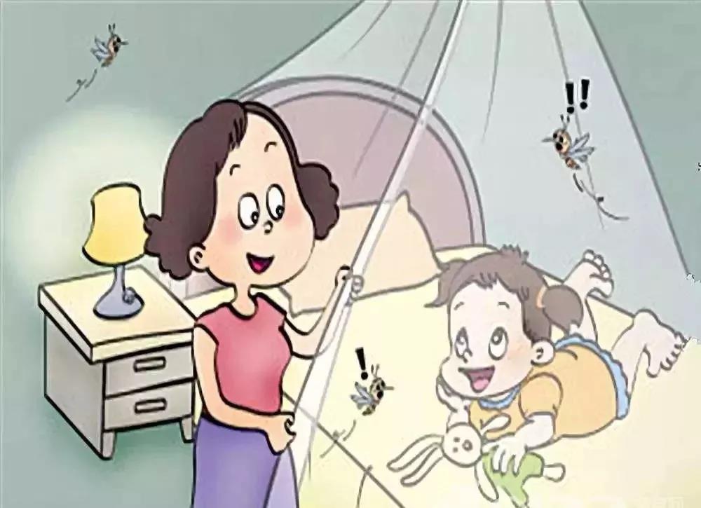 (五)午睡或晚上休息應(yīng)掛蚊帳,到公園、街邊等露天場(chǎng)所活動(dòng)應(yīng)注意采取防蚊措施,防止蚊蟲叮咬。