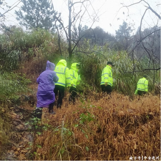 由于當(dāng)時(shí)天空已經(jīng)開始下起了蒙蒙細(xì)雨,加上老人走失地點(diǎn)地形復(fù)雜、山路崎嶇,能見度極低,給搜救工作帶來了極大的困難。雖然山路地濕路滑,但搜救人員不敢有絲毫懈怠,他們?cè)谧呤Ю先丝赡芡窘?jīng)的道路上,不停呼喊老人姓名,進(jìn)行地毯式搜索直至深夜,因?yàn)橐归g可視范圍小,一直沒有發(fā)現(xiàn)老人的蹤跡。考慮到天氣寒冷再加上老人體弱,九陂派出所第一時(shí)間向指揮中心請(qǐng)求支援,增派警力進(jìn)一步擴(kuò)大搜救范圍。