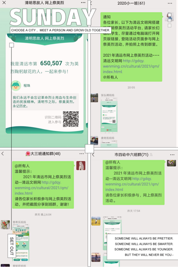 組織廣大教師,家長和幼兒大手牽小手登錄中國文明網(wǎng)、央視網(wǎng)、“文明清遠(yuǎn)”公眾號等平臺,通過在網(wǎng)上向先賢先烈鞠躬獻(xiàn)花、抒寫感言寄語的方式,表達(dá)對先烈先賢的感恩和敬仰,繼承和發(fā)揚(yáng)革命精神。