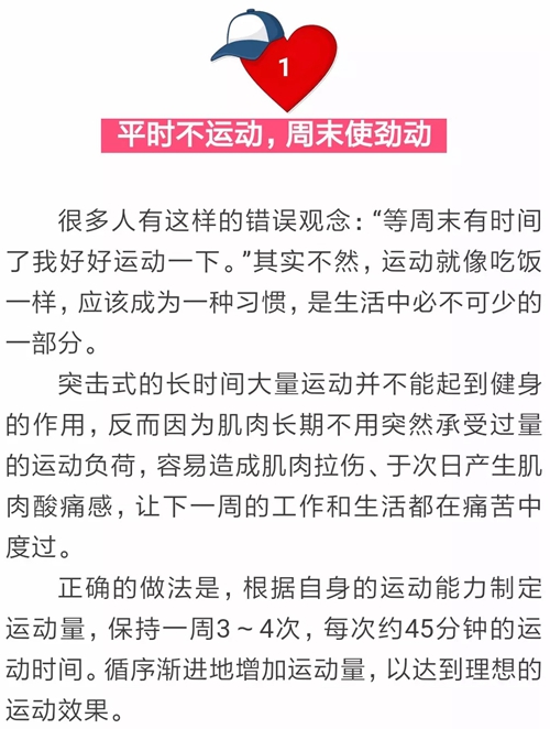不同于競(jìng)技體育,運(yùn)動(dòng)的目的在于保持健康的體魄,形式以有氧運(yùn)動(dòng)為主。有些人過(guò)分看重鍛煉的成績(jī),如跑步所用的時(shí)間、羽毛球比賽的輸贏等,甚至爭(zhēng)強(qiáng)好勝,不考慮自身體質(zhì)基礎(chǔ),強(qiáng)行加大運(yùn)動(dòng)量。