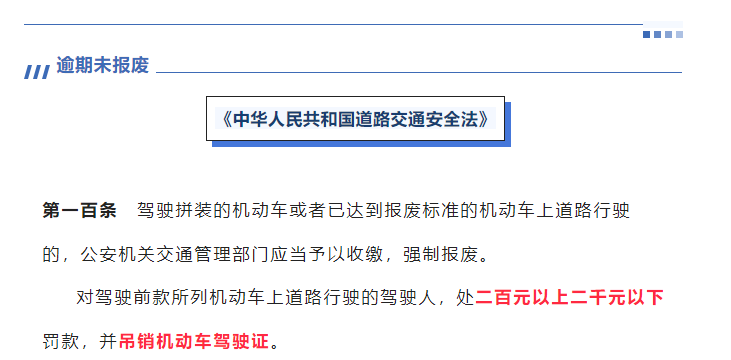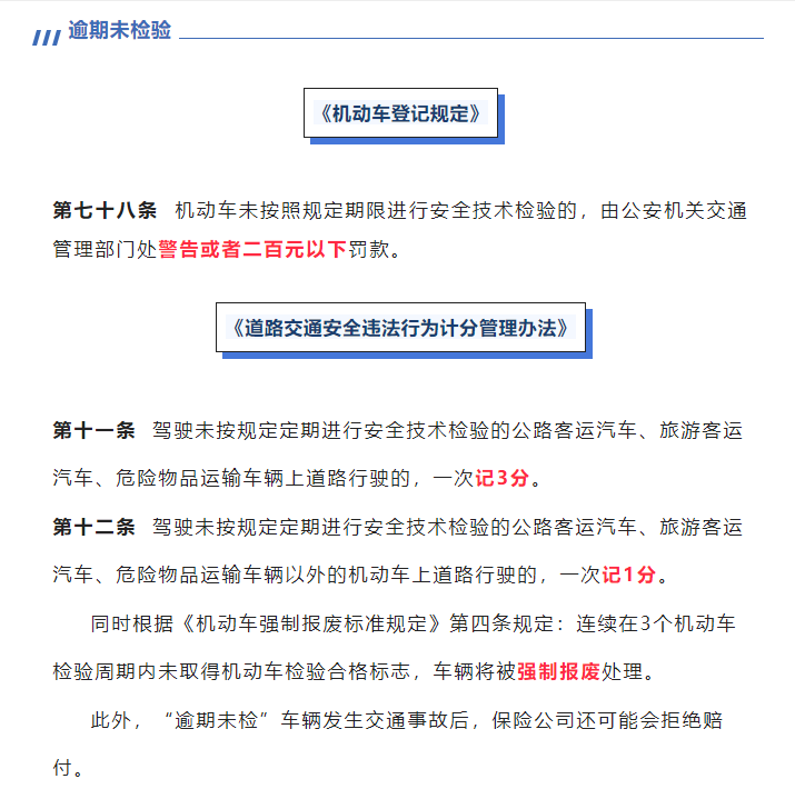 1、車輛強制報廢 連續(xù)三個周期未年檢車輛屬報廢車輛,駕駛報廢車輛上路,交警部門一經(jīng)查實,將依法吊銷駕駛?cè)说鸟{駛證。 2、交警有權(quán)扣車罰款扣分 未年檢車輛上路一經(jīng)查實,交警部門將暫扣機動車,進行罰款、扣分。對沒買交強險上路行駛的車輛,交警部門有權(quán)扣留機動車,并通知機動車所有人、管理人依照規(guī)定投保,并處應(yīng)繳納的保險費的2倍罰款。 3、出事故保險不賠償 按照《中華人民共和國道路交通安全法》相關(guān)規(guī)定,未年檢車輛上路,一旦發(fā)生交通事故,保險公司有理由拒賠,所有損失由車主自行承擔。 相關(guān)法律規(guī)定 法律規(guī)定的 吊銷駕駛證的情形
