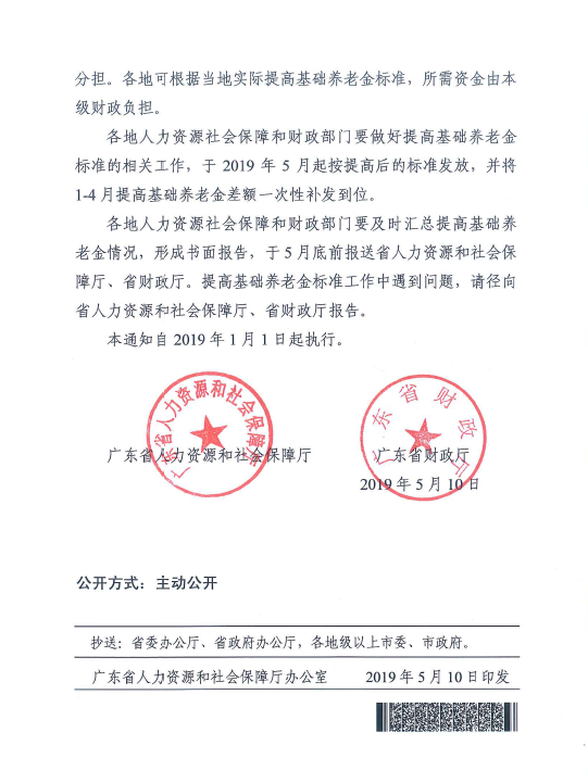 關(guān)于提高全省2019年城鄉(xiāng)居民基本養(yǎng)老保險基礎養(yǎng)老金最低標準的通知(粵人社規(guī)[2019]5號)